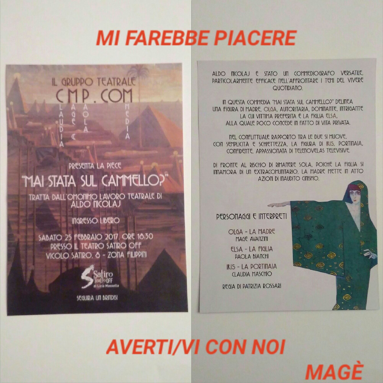 Nuovamente regista del Gruppo Teatrale CMP.COM nel 2017 con MAI STATA SUL CAMMELLO.