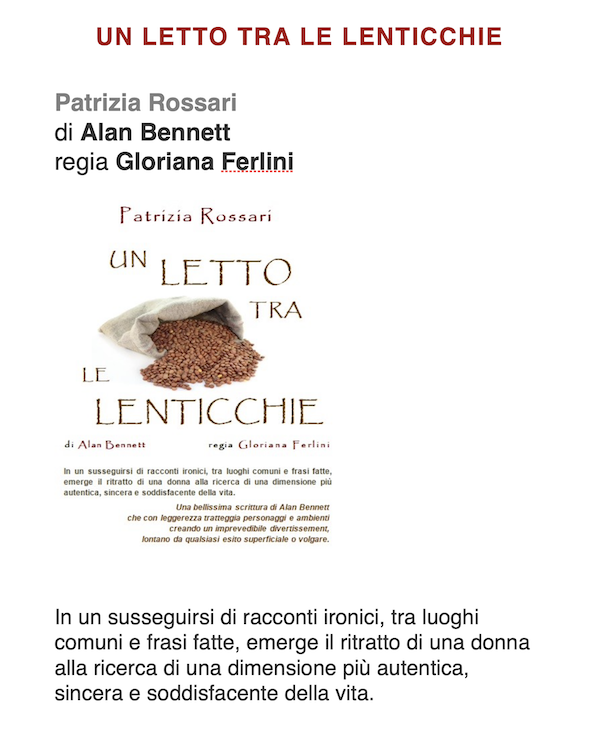 Sempre con la regia di Gloriana Ferlini altro testo, altro monologo interessante di Alan Bennet nel 2020 “Un letto tra le lenticchie”.