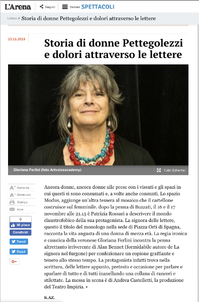 Con la regia di Gloriana Ferlini debutto nel Novembre 2018 di "LA SIGNORA DELLE LETTERE".