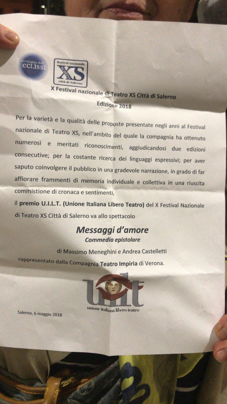 Premio U.I.L.T. (Unione Italiana Libero Teatro) del X° Festival Nazione di Teatro XS Città di Salerno 2018.
